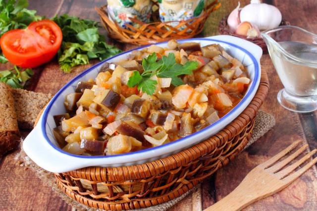 Экспресс рецепт овощного рагу из баклажанов. Подавать это блюдо лучше в холодном виде, когда оно полностью остынет. Оно хорошо подойдет ко вторым блюдам: картофельному пюре, макаронам, кашам, мясу, рыбе и т. д. В общем, закуска универсальная и всегда кстати. При подаче можно использовать свежую зелень, например, петрушку. Если вы любите тушеные овощи, то этот рецепт вам придется по вкусу. Главное, не передержать их на плите чтобы они не превратились в кашу. Времени на готовку уйдет минимум, как и затрат на продукты, особенно в сезон овощей, когда баклажаны и помидоры стоят недорого.