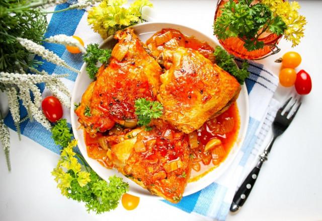 Отправьте в соус обжаренные куриные бёдра. Размешайте, чтобы мясо было полностью погружено в томатную подливу. При необходимости полейте ложкой каждое бедро отдельно. После повторного закипания пламя убавьте до минимума, накройте сковороду крышкой и тушите до готовности курицы (35-40 минут).