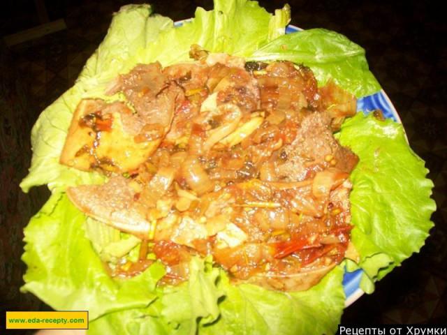 Для начала, он тщательно промыл говяжьи язык. Затем он налил в небольшую кастрюлю немного воды и поставил его на плиту. Когда вода закипело он положил туда говяжьи язык, посолил и убавил огонь. После этого он почистил лук, нарезал его полукольцами. Взял большую чугунную сковородку, налил туда подсолнечного масла и поставил разогреваться. Далее он положил в сковородку лук и обжарил его до золотистого цвета. Помидоры он нарезал тонкими кружочками, добавил к луку, посолил и поперчил, и оставил тушиться на маленьком огне. После этого он хорошенько промыл укроп, очистил чеснок. Укроп и чеснок он измельчил и положил в сковороду. Говяжий язык вынул из кастрюли и нарезал ломтиком и добавил к массе с луком. После этого он посолил и поперчил, все ингредиенты перемешал и оставил на плите на несколько минут. Готовил он приблизительно 2 часа.
