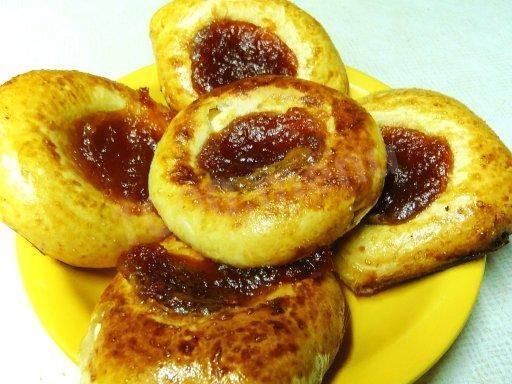 И заполнить это углубление разведенным с водой повидлом (оно не должно быть жидким). Ватрушки смазать взбитым яйцом и оставить в теплом месте на полчаса. Еще раз смазать яйцом. Выпекать в духовке при 180С 25 минут.