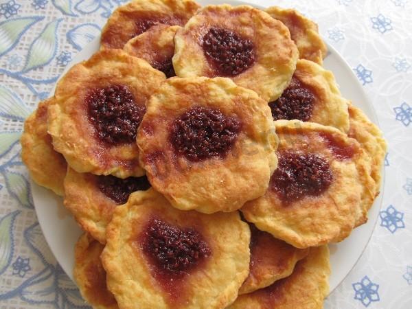 Ватрушки укладываем на противень, смазанный маслом. На каждую ватрушку кладем немного варенья. Ставим в нагретую до 180 град. духовку минут на 15-20.