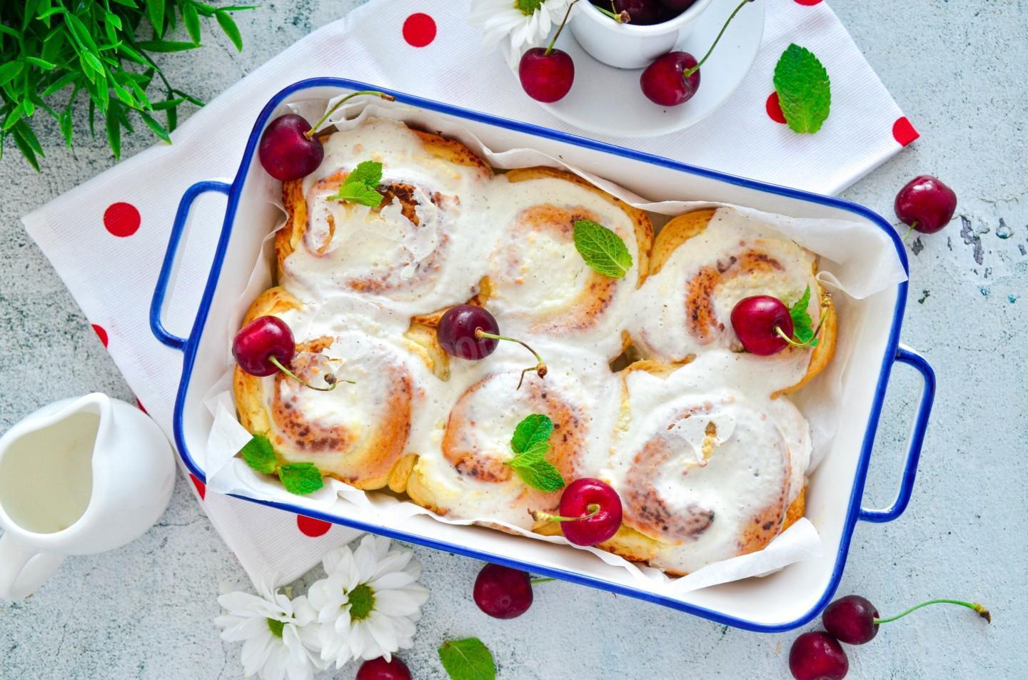 Красивые, пышные, аппетитные, тают во рту! Творожные завитушки в сметанной заливке — это русский вариант модных синнабонов. Только вместо корицы в рулет заворачивается творожная начинка. А в роли крема, которым смазывают верх булочек, выступает сметана.