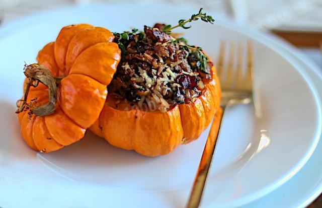Тыкву, фаршированную рисом и мясом, лучше подать на стол сразу, пока горячая. Блюдо вкусное до самой корки. Приятного аппетита!