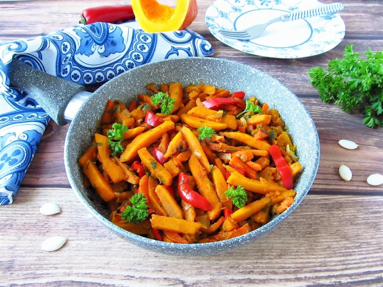 Яркое овощное блюдо для тех, кто любит тыкву. Мякоть тыквы очень нежная, поэтому при приготовлении важно следить за временем, не передержать овощи на сковороде. Тогда кусочки сохранят форму и вкус блюда будет естественным. Тыква с овощами подойдет для вегетарианского или постного меню.