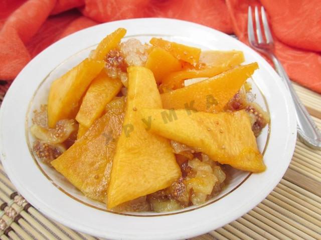 Кисло-сладкий десерт из хрустящей тыквы с цитрусовым ароматом - вкусно. Очень простой десерт, который неизменно пользуется успехом даже у тех людей, которые не очень любят тыкву. Дело в том, что в этом блюде тыква по вкусу и запаху совсем на себя не похожа, как мы привыкли в тыквенной каше или начинке для выпечки. Здесь она хрустящая и кисло-сладкая, а десерт пахнет цитрусовыми, так что с первой ложечки никто даже не догадается, из чего приготовлено это блюдо.