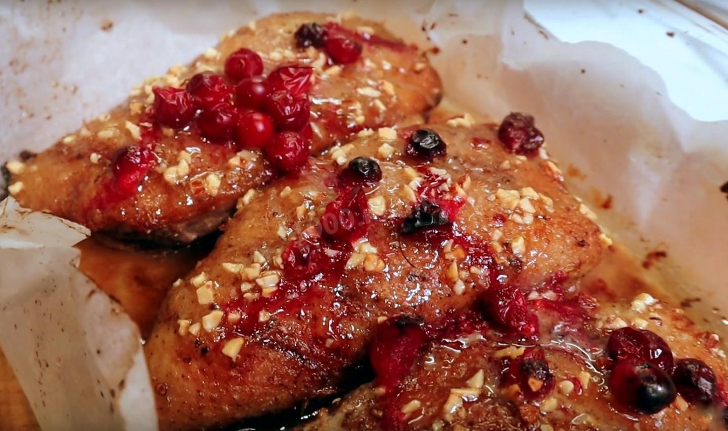 После добавления клюквы перекладываем грудку в стеклянную тару, чтобы запечь ее в духовке. Время запекания - 15 минут, температура - 180 градусов. По прошествии указанного времени достаем грудку из духового шкафа, блюдо готово. Подать такую утку можно с любым гарниром на Ваше усмотрение. Приятного аппетита!