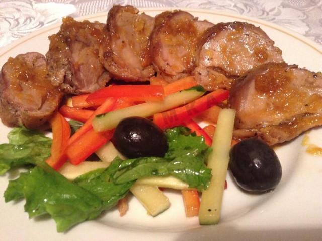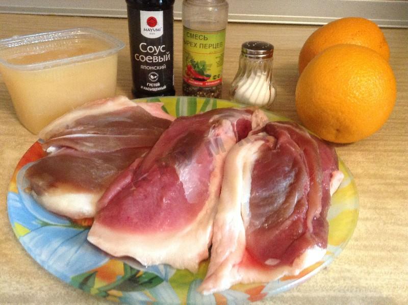 Ингредиенты: утиные грудки, мед, соевый соус, апельсины, перец, соль.