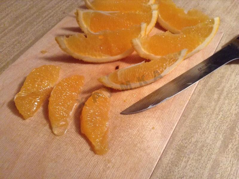 А пока грудки готовятся, сделаем соус. Один апельсин нарезаем на дольки и снимаем ножом шкурку.