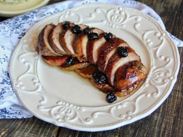 Выбираем форму для запекания, выкладываем слой яблок, нарезанных тонкими пластинками, наверх выкладываем утиные грудки и поливаем соусом со сковородки. Отправляем форму в духовку на полчаса и выпекаем при 180 градусах.