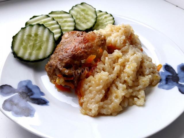 Промойте рис, выложите его в форму для запекания. Залейте водой. Подсолите и можно добавить куркуму или карри. Сверху выложить зажарку
