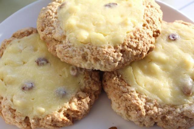 В глубокую посуду высыпаем просеянную муку, добавляем сахар, ванильный порошок и разбрасываем порезанные кусочки масло. Затем рубим их вилкой до крошки. Яйца взбиваем вилкой и добавляем к муке, перемешиваем. Добавляем погашенную соду, которую гасим 1ст.л. уксуса. Перемешиваем и быстро замешиваем тесто. Раскатываем тесто пластом примерно 1 см толщиной, и вырезаем небольшие кружочки примерно 10-12 см диаметром. Выкладываем наши кружочки на противень с высоким бортом. Предварительно укрываем противень пекарской бумагой. Посередине кружочков делаем углубления. После этого делаем начинку. Отделяем один желток от белка. Белок добавляем к остальным яйцам и взбиваем с сахаром, до тех пор, пока яичная масса не увеличится в объёме три раза. Творог протираем через сито и смешиваем с манкой, ванильным сахаром и соком лимона. Затем в эту массу выкладываем взбитые яйца, осторожненько перемешиваем. Яблоки очищаем от кожуры и сердцевины, нарезаем мелкими кубиками, изюм промываем и делим каждую изюминку пополам. Затем углубление в кружочках заполняем начинкой. Выпекаем минут 30в разогретой духовке.