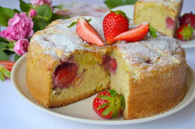 Вкусный летний пирог с клубникой и ревенем. Сегодня на даче пересаживала ревень и вспомнила, что у меня есть рецепт замечательного пирога с ревенем и клубникой. Так как клубнично-ревеневый сезон не за горами, делюсь с вами рецептиком. Бисквит получается высоким, пышным и рельефным благодаря начинке.