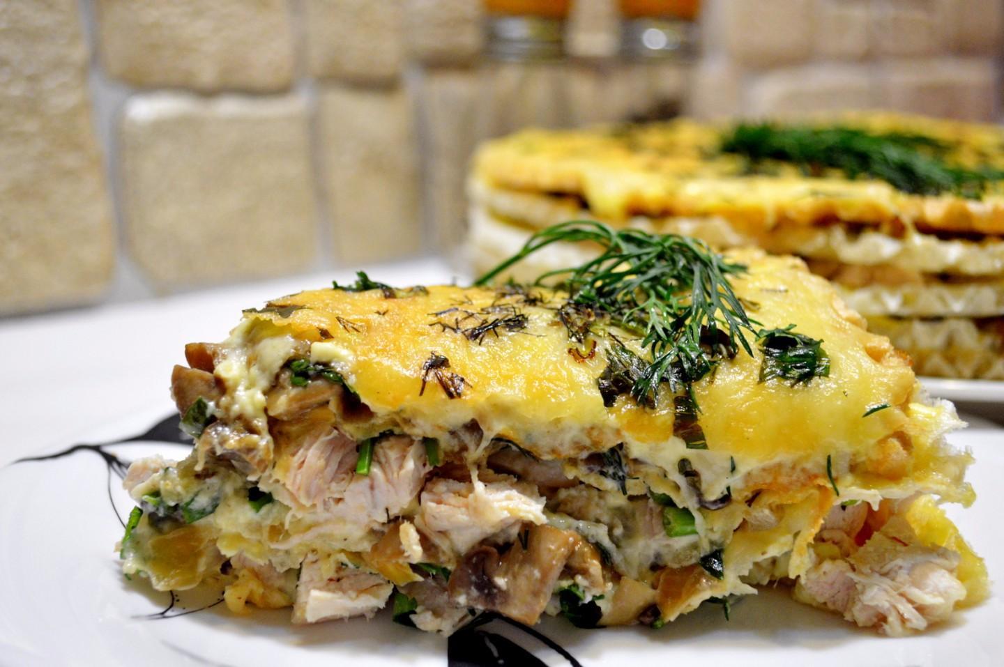 Собираем торт слоями, каждый слой смазываем майонезом и по желанию перчим.(корж, майонез, курица, зелень, корж, майонез, грибы, зелень и повторяем ещё раз).