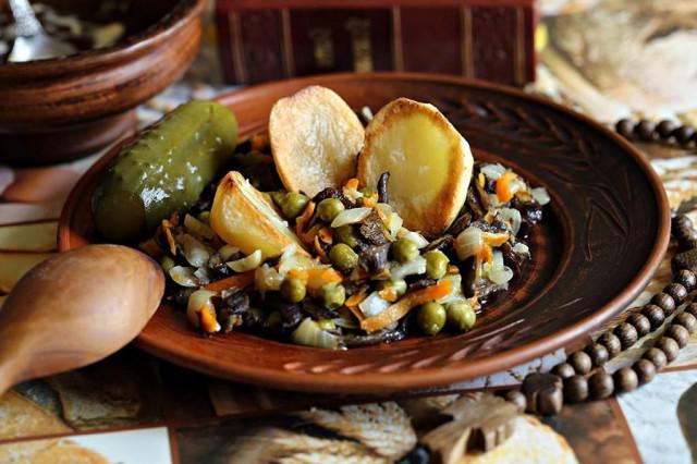 Отличное сытное блюдо для постящихся, вегетарианцев и любителей грибов. Действительно простое и сытное блюдо, без излишеств и не требующее больших усилий при готовке. Грибы у нас всегда есть в морозилке, горошек тоже стараемся запасать впрок - он очень хорошо дополняет это ароматное блюдо. Попробуйте приготовить!
