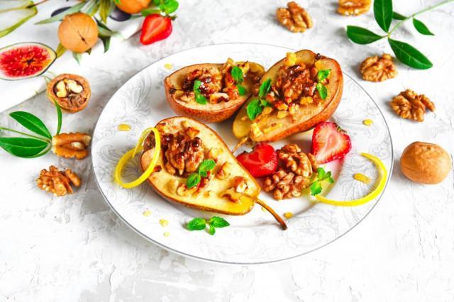 В серединку каждой половинки груши выложите по 2 сложенные вместе половинки грецких орехов. Грецкие орехи можете заменить любыми другими орехами по вкусу. Хорошо подойдет пекан, фундук, кедровые.