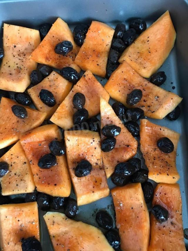 Тыкву очистить и нарезать кусочками. Смазать маслом форму и выложить тыкву. Посолить, поперчить , сбрызнуть оливковым маслом тыкву. Добавить оливки. Выпекать при 180 градусах 30 - 40 мин.
