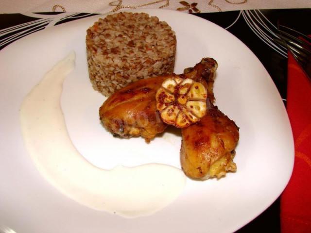 Куриные ножки выложить в форму, к ним чеснок, чуть долить маринада. Прикрыть фольгой и в прогретую до 180 гр. духовку с режимом гриль-конвекция (если такого нет, то обычный режим) на полчаса. Фольгу снять и оставить на 20 минут, подняв темп. до 200.