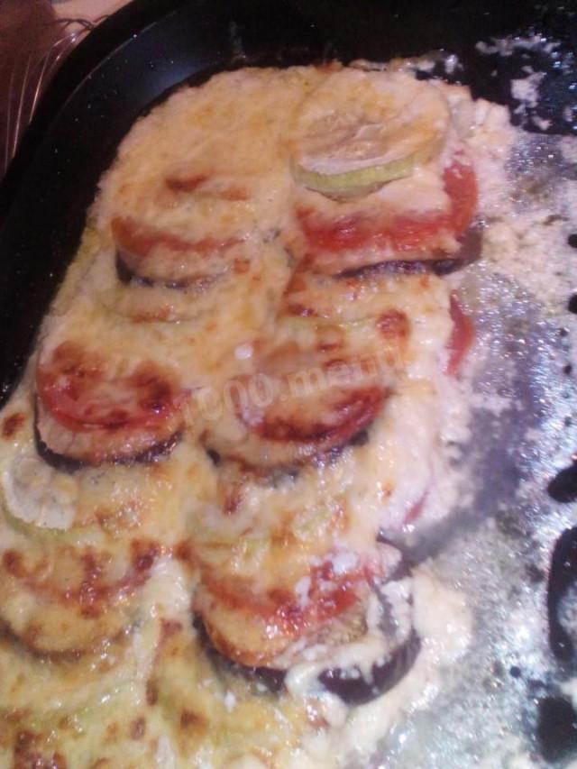 В смазанную маслом форму выкладываем поочередно: баклажан, помидор, лук, кабачок. Солим и перчим. Ставим в разогретую духовку на 10 минут