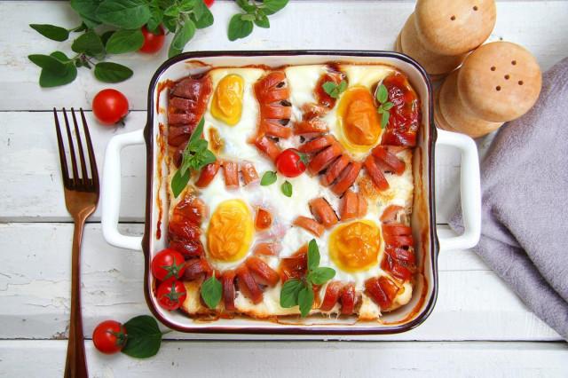 В центр каждой пружинки вбейте по яйцу. Постарайтесь не повредить желток: так запеканка получится максимально красивой. Запекайте в заранее разогретой до 180 ⁰С духовке в течение 30-40 минут.