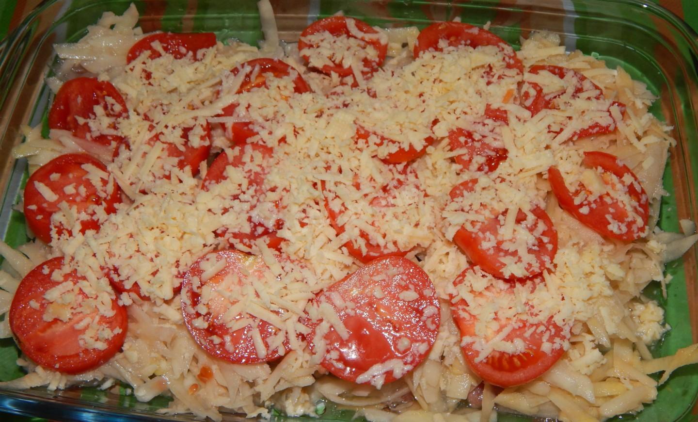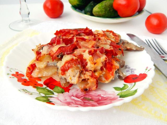 Запеканка из куриного филе с картошкой, грибами и сыром