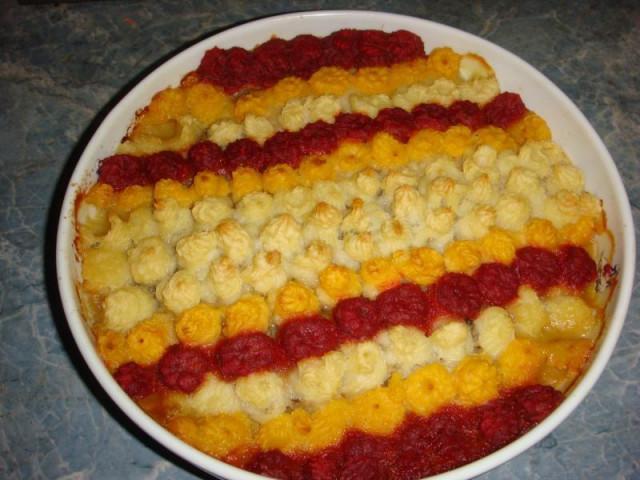 Затем выложить желтое пюре, затем - красное.