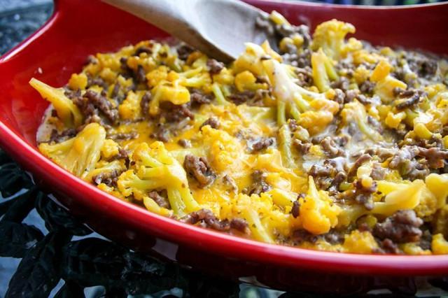 6. В глубокой жаропрочной форме соедините фарш с цветной капустой, налейте сырный соус. Все тщательно перемешайте и добавьте оставшийся сыр.