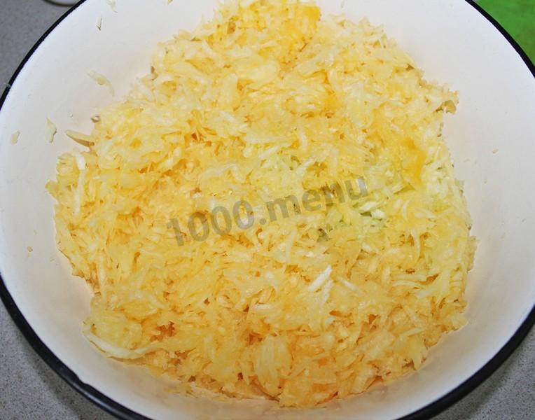 Очищенные от кожуры и семян кабачки натереть на терке с крупными отверстиями. Оставить на 30 минут для того, чтобы выделился сок. Затем хорошо отжать кабачки.