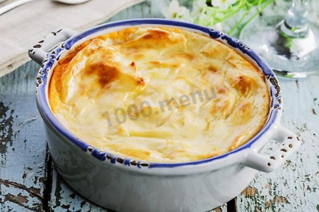 4. Смажьте форму для запеканки маслом и выложите половину картофеля ровным слоем. Так же ровно выложите фарш, и сверху - вторую часть картофеля.