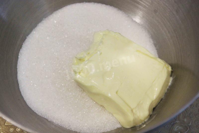 Всыпаем сахар в глубокую миску, в которой будем замешивать тесто. Добавляем в него размягченное сливочное масло, которое нужно предварительно вынуть из холодильника и оставить на какое-то время при комнатной температуре, чтобы оно как следует подтаяло.