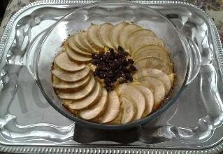 Яблоки разрезать на четвертинки, вырезать сердцевинку и нарезать дольками. Выложить дольки сверху на смесь, немного вдавливая. Немного присыпать песком. Середину выложить изюмом. Яблоки у меня Гольден, да еще в апреле, немного жестковаты. Со свежими, сочными получается вкусней. Ставим в разогретую до 200 гр духовку на 30 мин