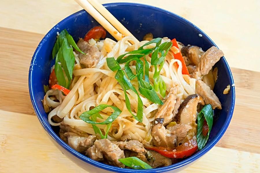 Жареная лапша удон со свининой и овощами