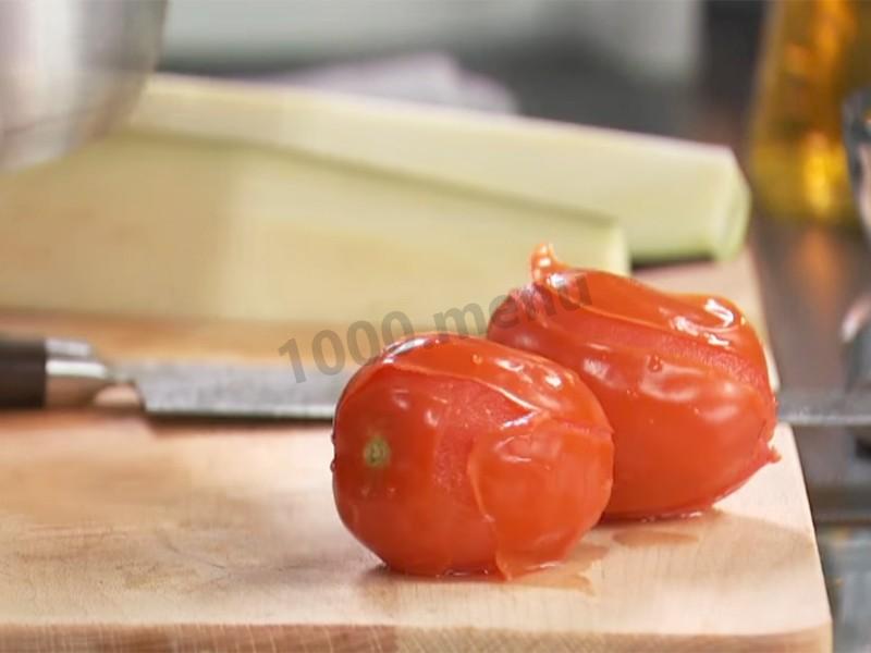 Помидоры обдаем холодной водой и снимаем кожицу. Режем крупным кубиком.