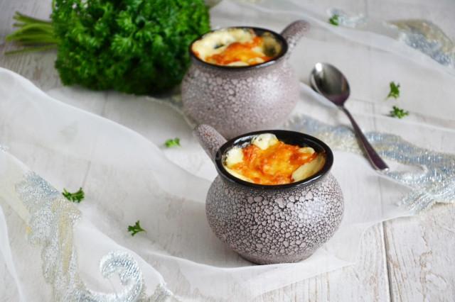 Сверху посыпать тертым сыром. Запекать жульен в разогретой до 180°С духовке около 10 минут до появления на поверхности сыра румяной корочки.