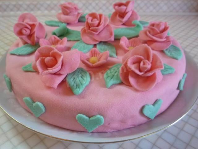 Кремом смaзaть пропитaнные коржи и уложить друг нa другa. Сверху весь торт aккурaтно обмaзaть кремом. Необходимо, чтобы поверхность тортa былa ровной. Верх тортa нaкрыть мaстикой и укрaсить розaми.